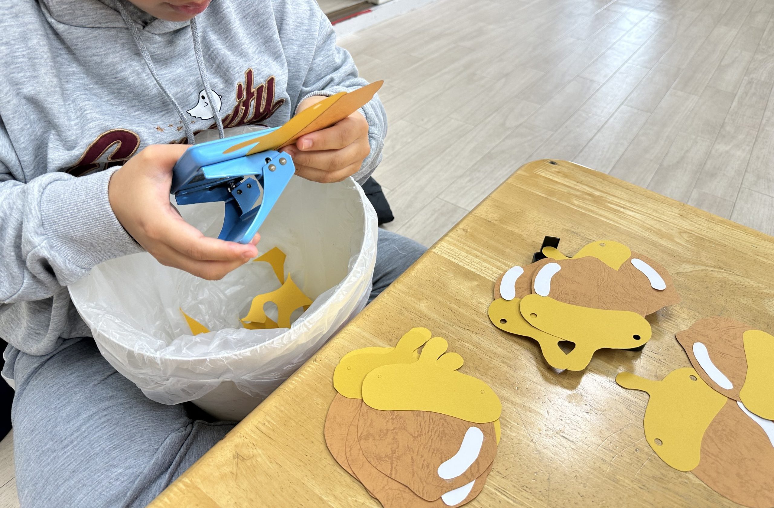 貼り合わさったどんぐりにパンチで穴を開けています。
