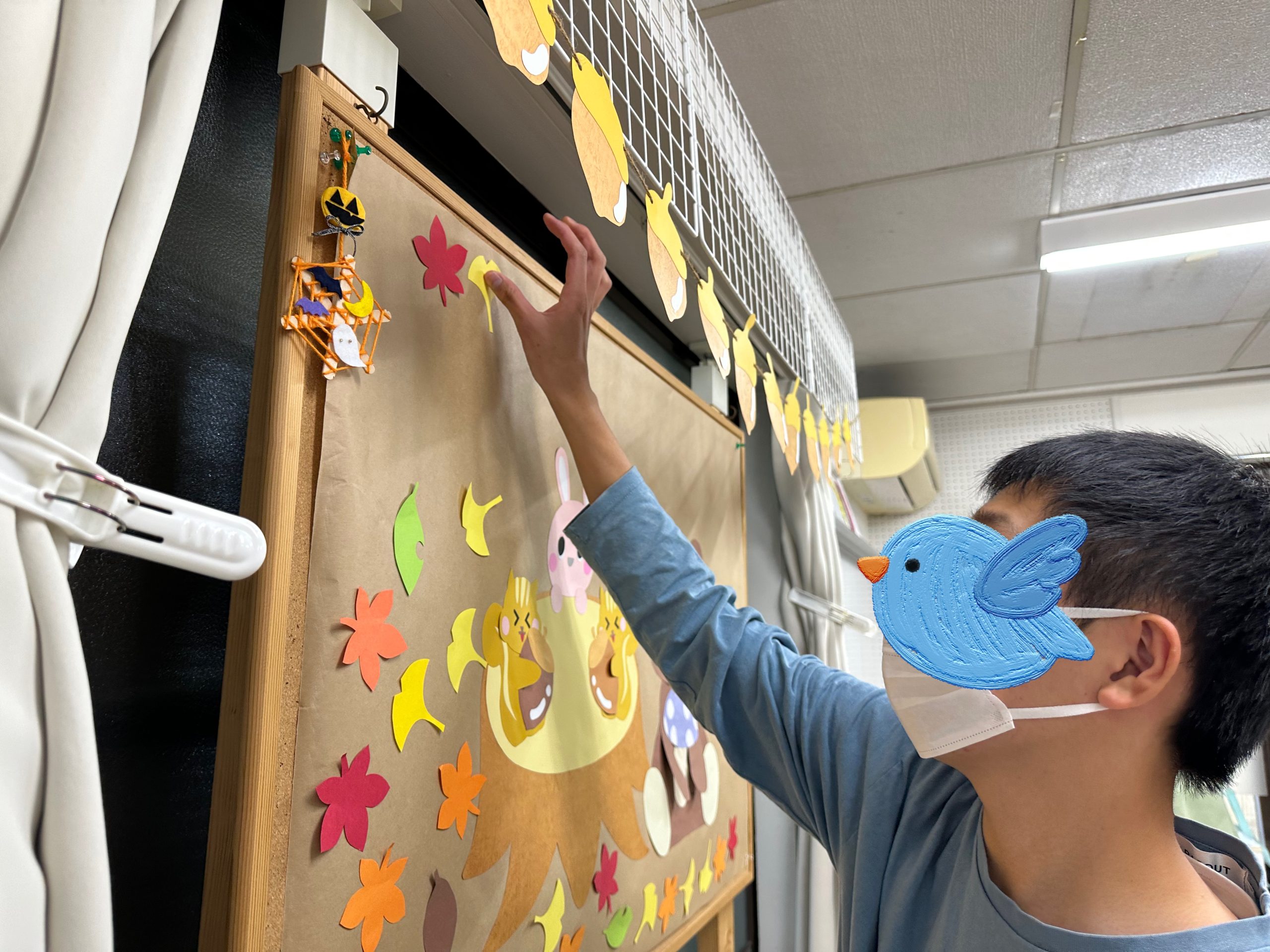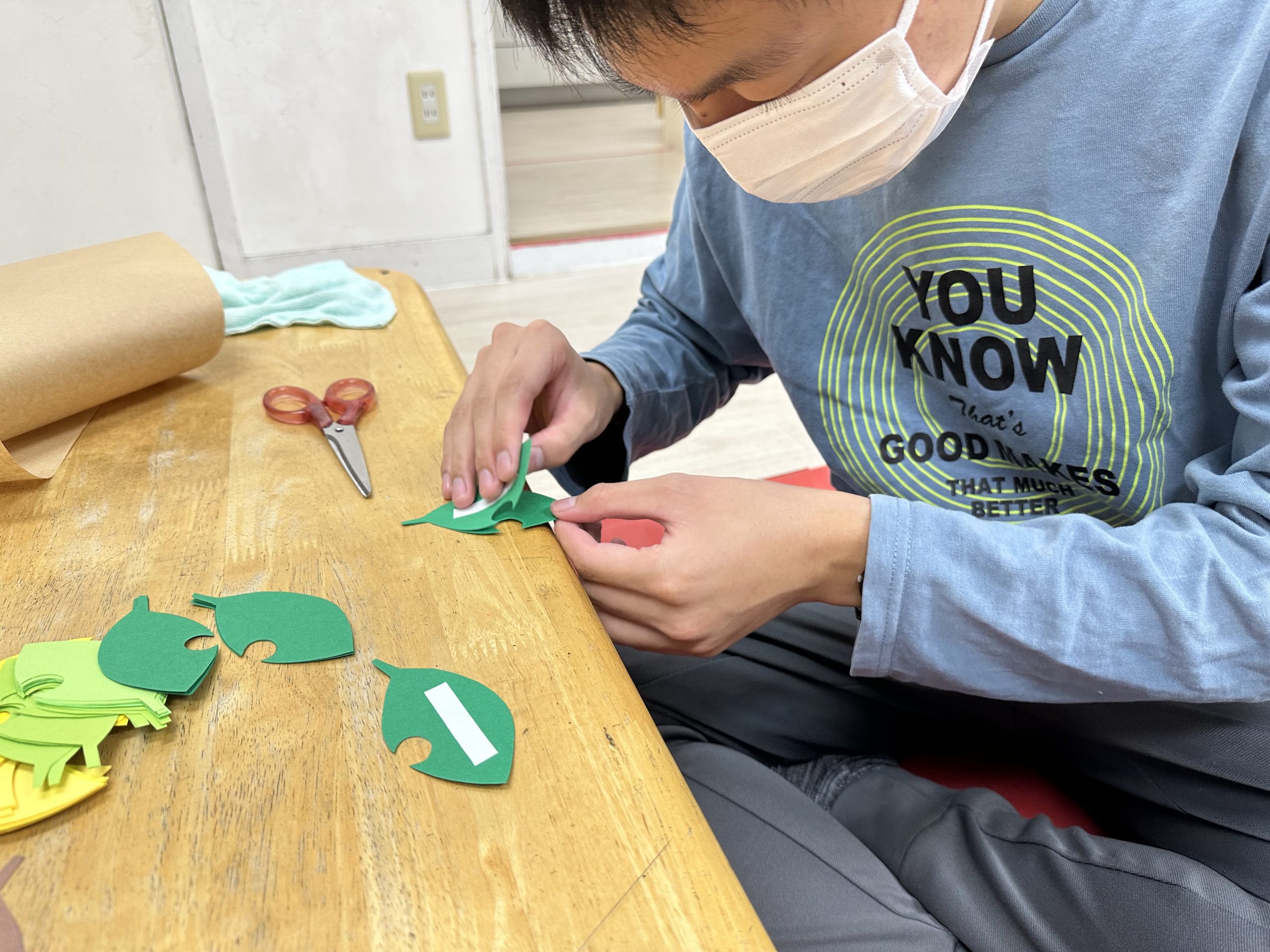 次は落ち葉の制作です、みんなが簡単に貼れるように、のりではなく今回は両面テープにしました。