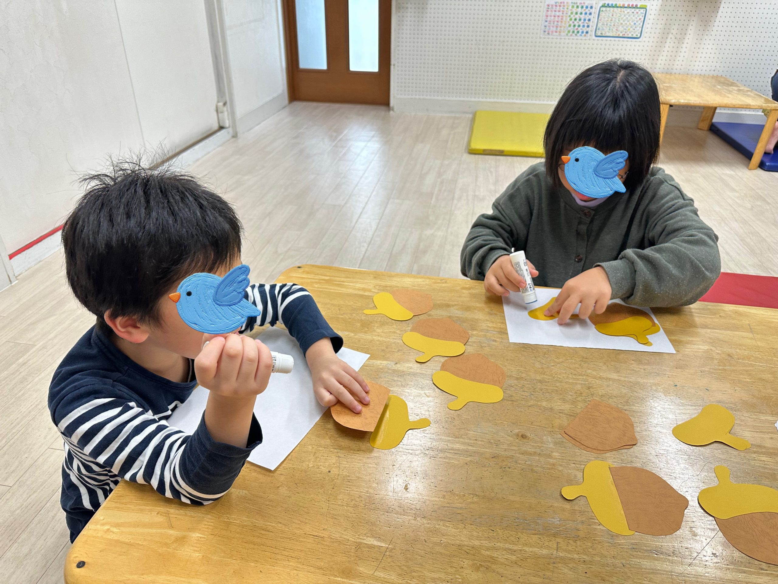 こちらはドングリの実とカサを貼り合わせる作業です。