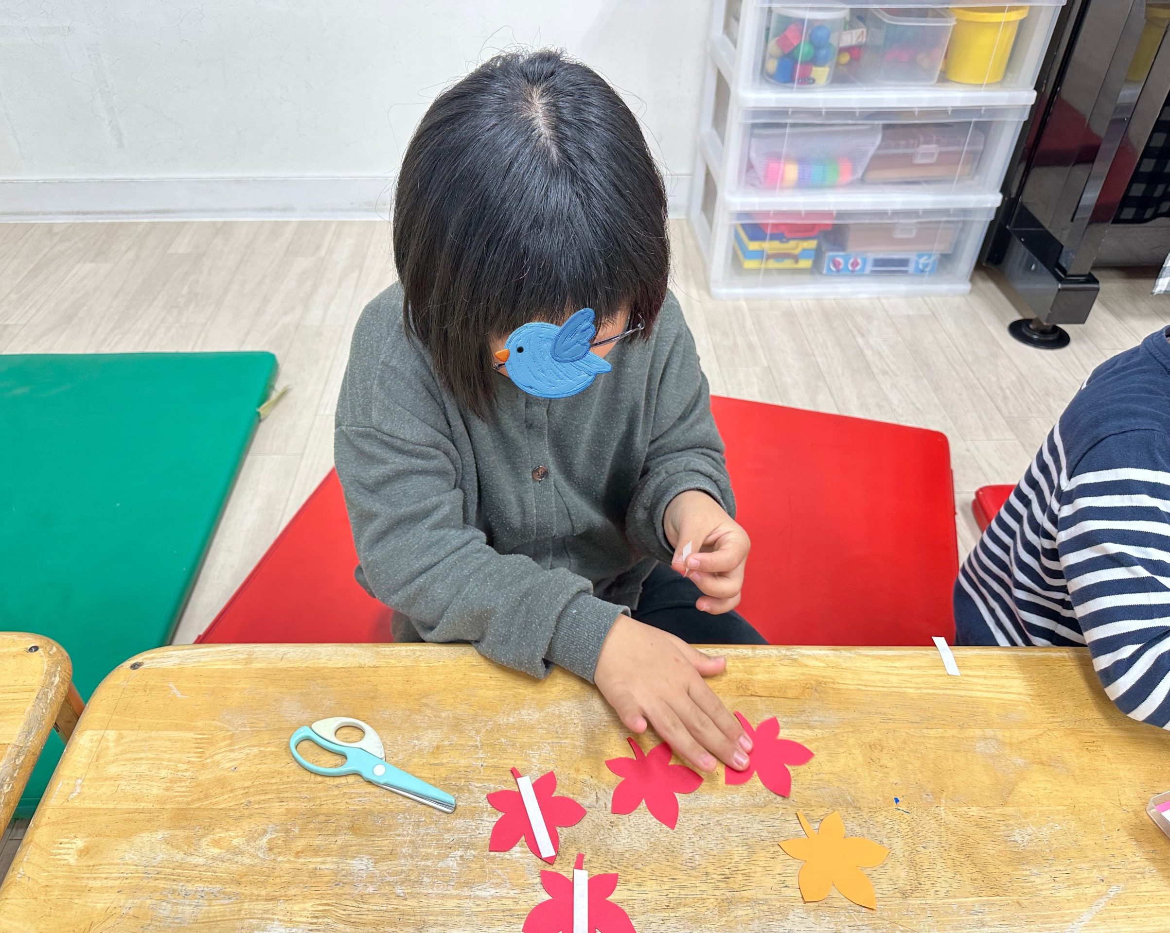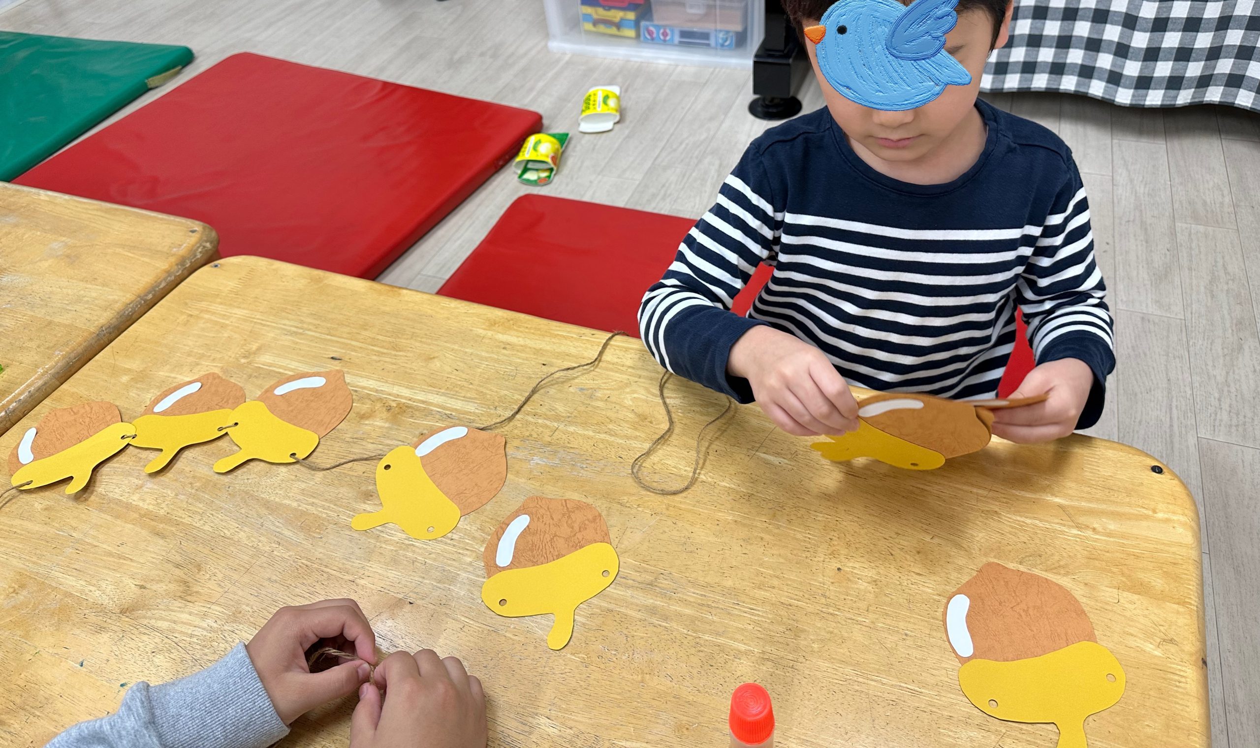 飾った時に糸がどんぐりの裏を通るように。「この穴から糸を入れて、ここから出すよ」と細かい指定をさせてもらいましたが、しっかり理解し全部のどんぐりに糸を通してくれました。とても集中していましたよ♡