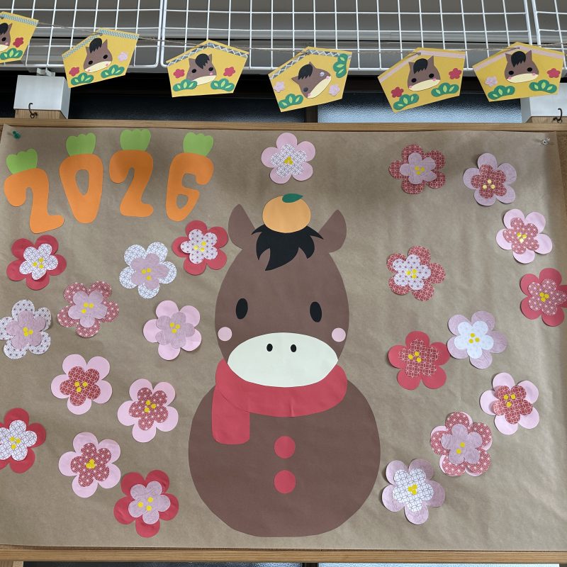 新年2日目は、壁面制作をしました。 ひとりひとり、絵馬を作ってもらい 願い事や一年の目標なども書いてもらいました。 鉛筆を持つと迷わず名前を堂々と書きだす子や、 お手伝いを頑張ると書く子、 楽しい!とその時の気持ちを書い …